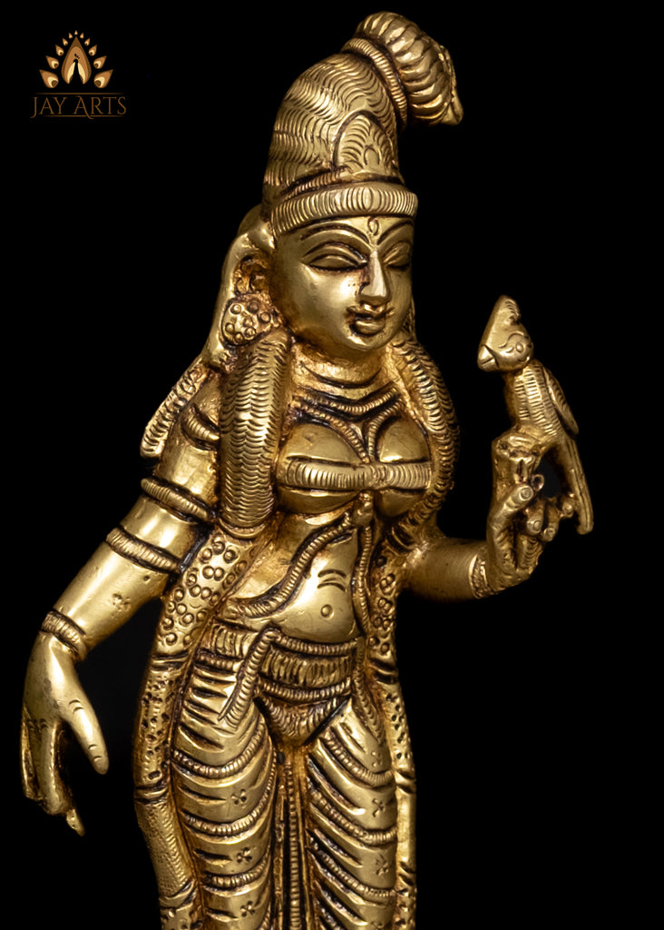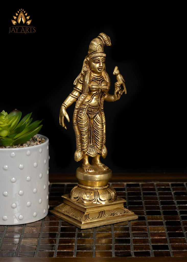 Product description: The statue portrays Goddess Andal in a graceful standing posture, adorned with traditional ornaments and garlands that cascade delicately over her form, symbolizing her eternal devotion to Lord Ranganatha. Her serene face with gently arched brows and lotus-petal eyes radiates youthful joy and unwavering bhakti. A delicate parrot, her constant companion and symbol of divine love, rests on one of her hand, while the other hand rests in a graceful gesture. Her attire, sculpted with intricate patterns reflects the rich Tamil tradition and draped in an elegant manner. Behold the divine elegance of Andal, the only female Alvar saint, an embodiment of love; the idol speaks of devotion, purity, and divine femininity.