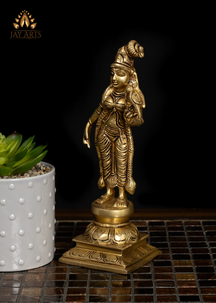9" Brass Goddess Andal Standing on a Lotus Divine Goddess Statue