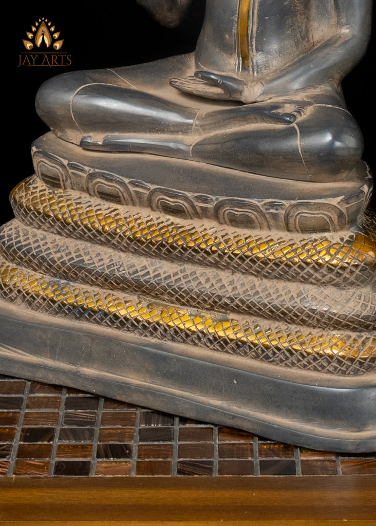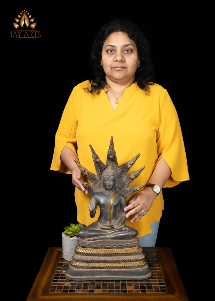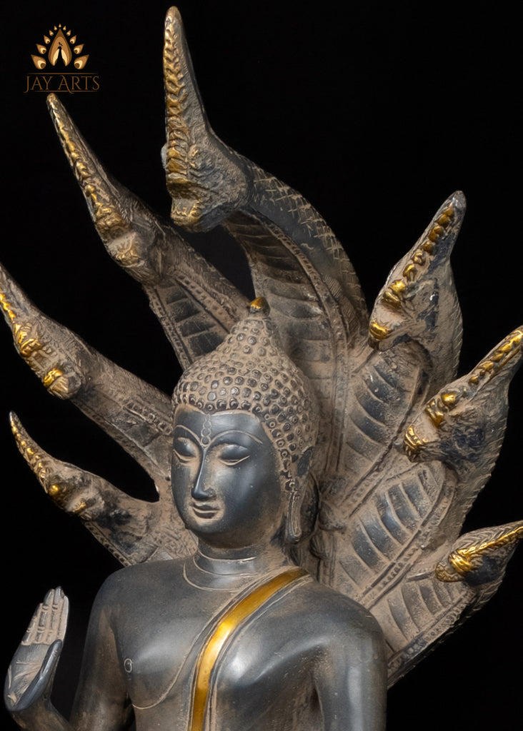 Product description: The statue portrays Buddha in abhaya mudra, seated in Ardha padmasana position on a coiled seven headed Naga which spreads its hoods to form a protective canopy above him. This representation symbolizes protection, serenity, and enlightenment. The face of the Buddha has a calm expression, with long earlobes, raised brows, with eyes half closed in self contemplation, and a gentle smile that conveys inner peace and compassion. The expression of Naga Buddha is beautifully captured, and the antique black patina with gold highlights gives a pleasing tactile sensation adding to its visual appeal. The statue is a perfect piece for any meditation or scared space, that evokes a sense of timeless elegance and profound symbolism.