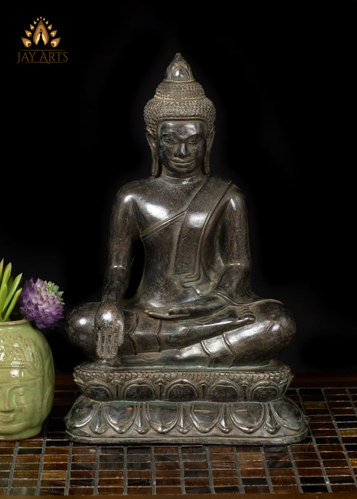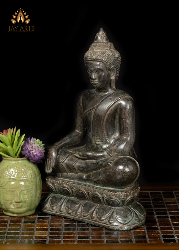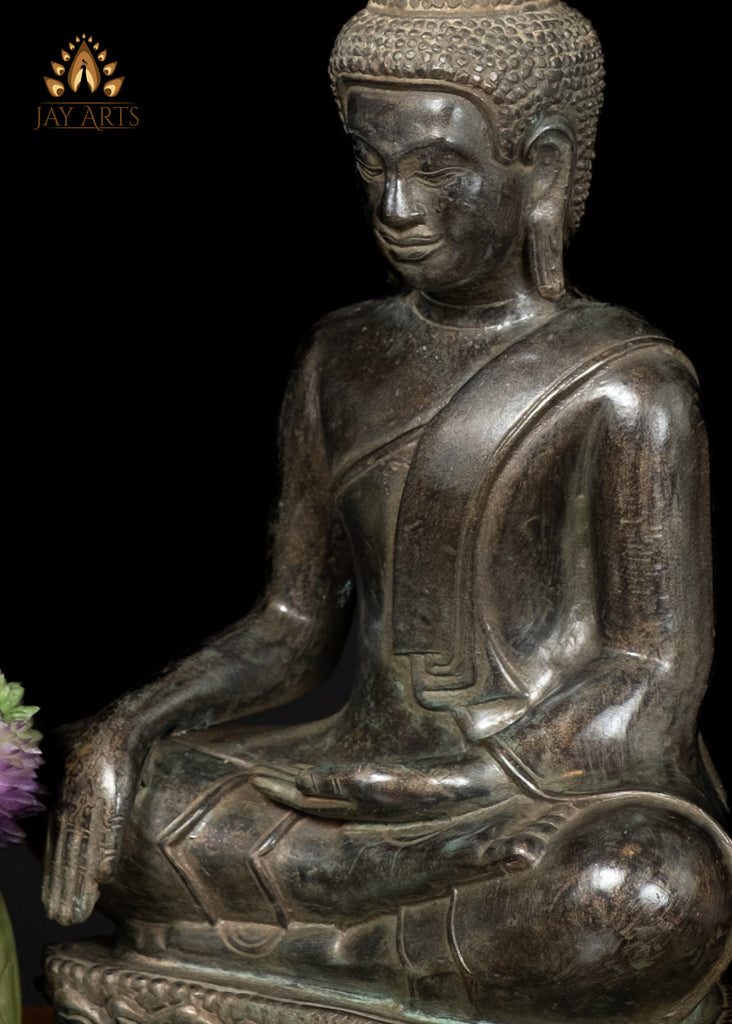 Product description: This captivating small bronze Buddha statue depicts the moment of enlightenment, with the Buddha seated in half lotus position with his right hand gently touching the earth, the Bhumisparsha Mudra, symbolizing steadfastness and awakening. The sculpture radiates serenity through its calm, smiling face with eyes open, arched brows, graceful posture, and the robe drapes naturally over the body, emphasizing Buddha’s tranquil poise and meditative stillness. His elongated earlobes, is a symbol of his royal renunciation, and the protuberance on the top of the head is called the Ushnisha which symbolizes his enlightened wisdom. Every feature reflects the distinctive Khmer style, and the deep green, weathered look brings out the depth and details of the statue enhancing the visual appearance that echoes the grace of ancient temples. A perfect representation of traditional Buddha art highlighting the fine workmanship by our artisans of Cambodia—this sculpture adds positivity and timeless charm to your home, office or any sacred space.