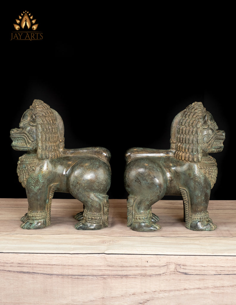 12" Cambodian Style Bronze Temple Lions Finely Detailed with Aged Green Finish