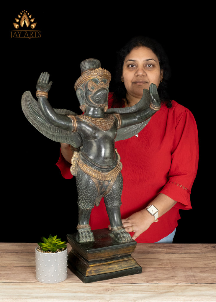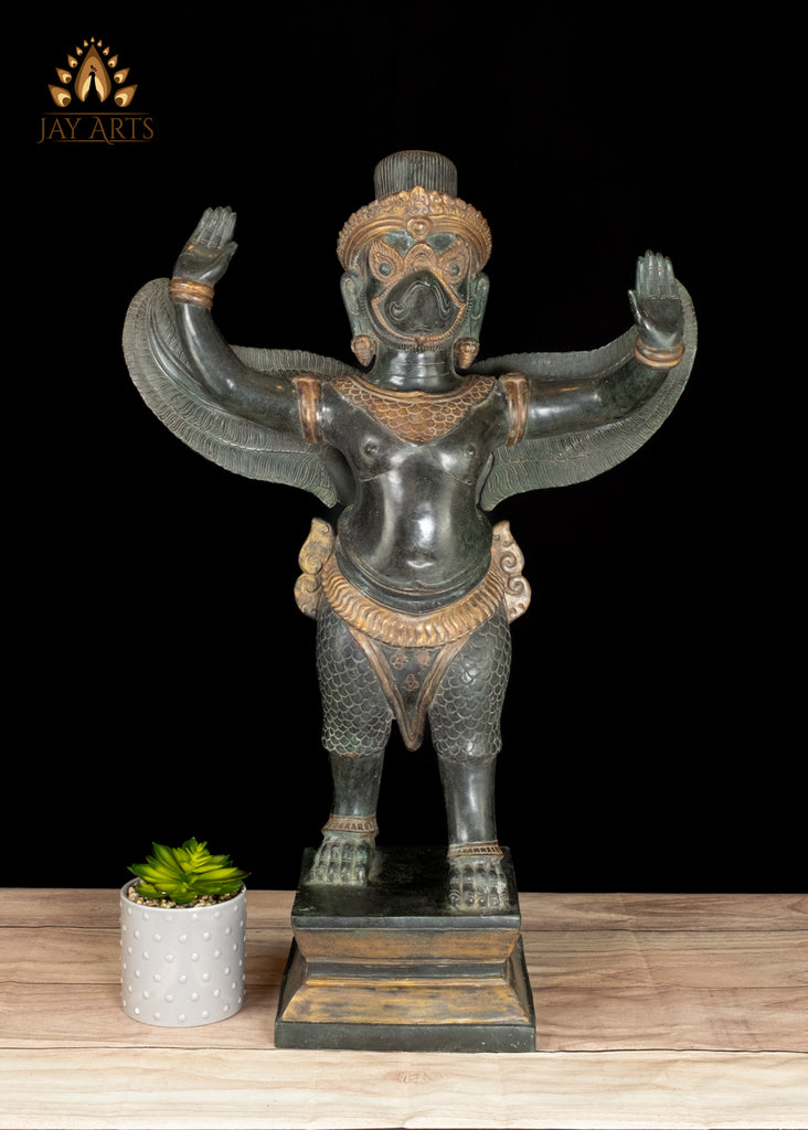 Product description: This is a striking and powerful Cambodian Garuda statue, full of movement and regal presence. Garuda is shown standing tall with wings fully outstretched, arms raised in a commanding gesture that conveys protection, strength, and divine authority. The statue is adorned with a decorative Khmer-style crown with floral and geometric motifs, and has scaled leg armor and anklets reflecting traditional iconography, and stands on a strong tiered base, in a dynamic posture. His bold facial features, pronounced beak, and intense expression give the figure a fierce, guardian-like energy. The dark antique patina is beautifully contrasted by warm golden highlights on the crown, jewelry, belt, and wing details, bringing depth and richness to the piece. The feathered wings are finely textured, flowing outward in elegant curves that frame the body dramatically. This beautiful bronze Garuda embodies divine protection and guardianship, a timeless symbol in Southeast Asian art. Both sacred and sculptural, this Garuda makes a compelling centerpiece for any living space.