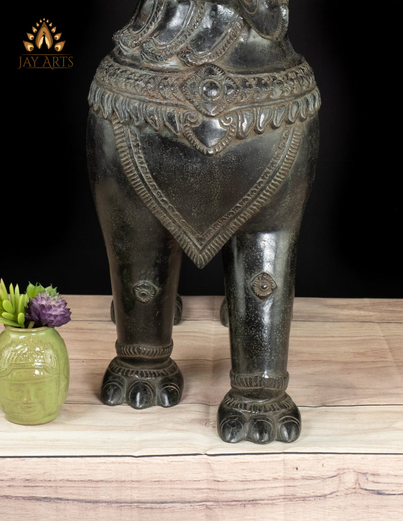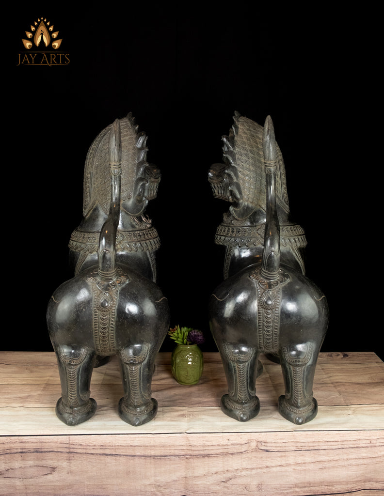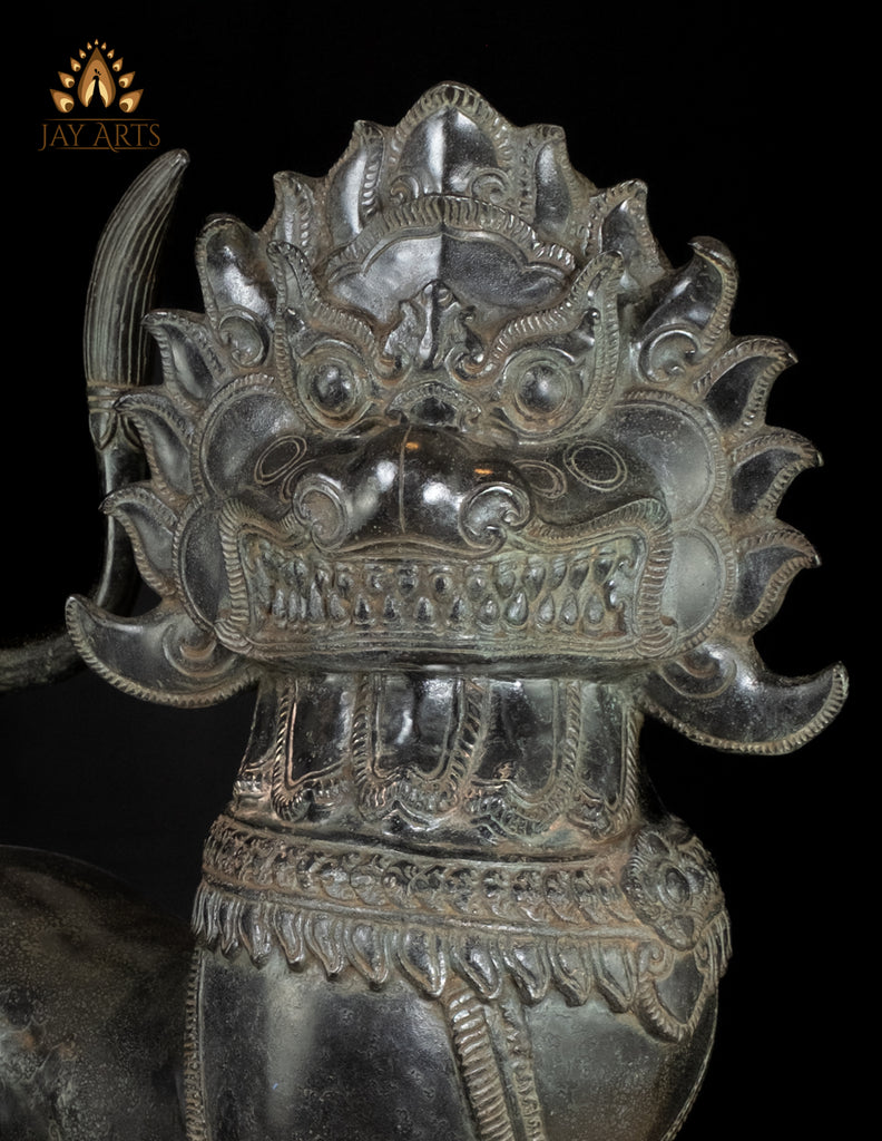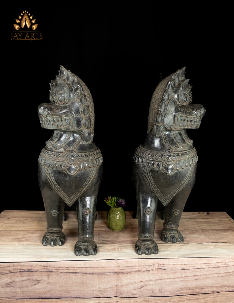 Product description: These commanding Khmer Temple Guardian Lions, often known as Foo Dogs embody the timeless role of sacred protectors found at the entrances of ancient temples across many South East Asian countries. Standing with unwavering authority, this magnificent bronze Lion pair radiates both power and dignity, welcoming all who approach while fiercely guarding against negative forces. Each lion is exquisitely handcrafted by a skilled Cambodian artisan, showcasing extraordinary attention to detail. Their expressive, wide eyes with etched pupils, pronounced brows, boldly carved noses, and wide open mouths reveal sharp, carefully defined teeth, symbolizing vigilance and strength.The ornate, curling mane frames the face with regal splendor. Their robust bodies and firmly planted paws project stability, courage, and divine guardianship. The black patina enhances the sculptural depth, accentuating every engraved motif and contour, lending the lions a quiet, museum-worthy presence. Majestic yet harmonious, these temple lions are more than decorative sculptures—they are symbols of protection, authority, and sacred balance. A striking statement for an entryway, altar space, or collector’s interior, they bring the spirit of Khmer temple architecture into any setting with enduring elegance and authenticity.