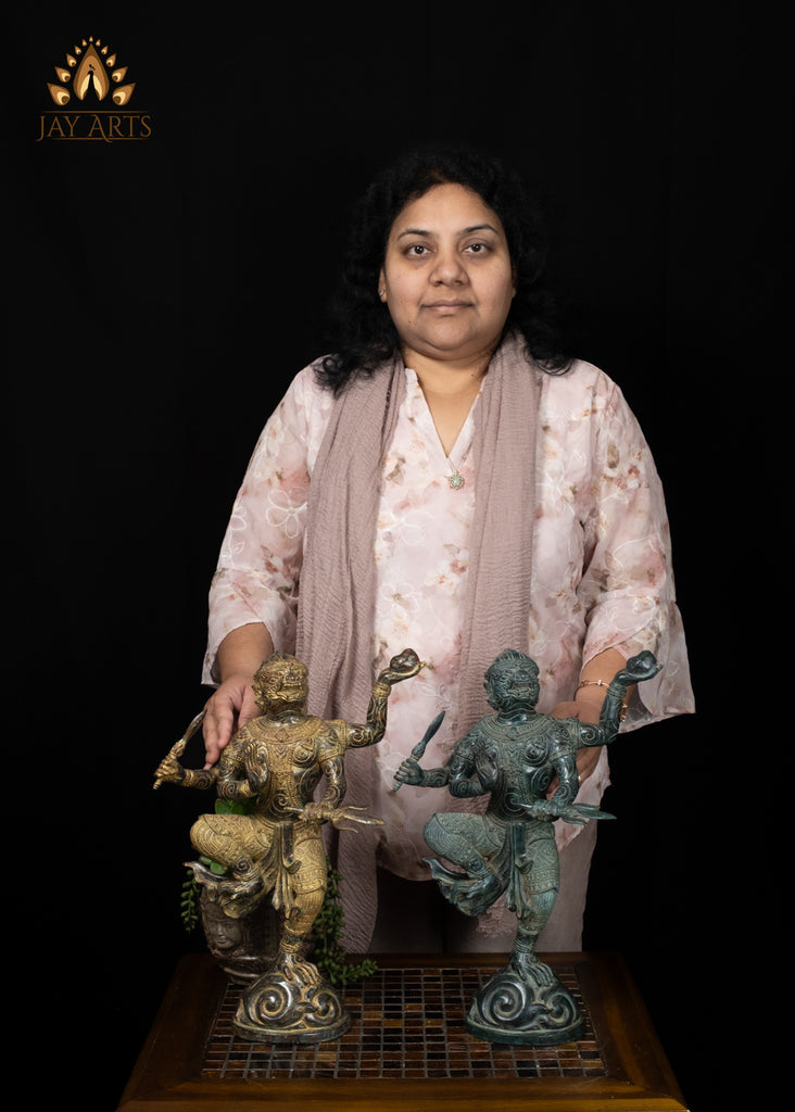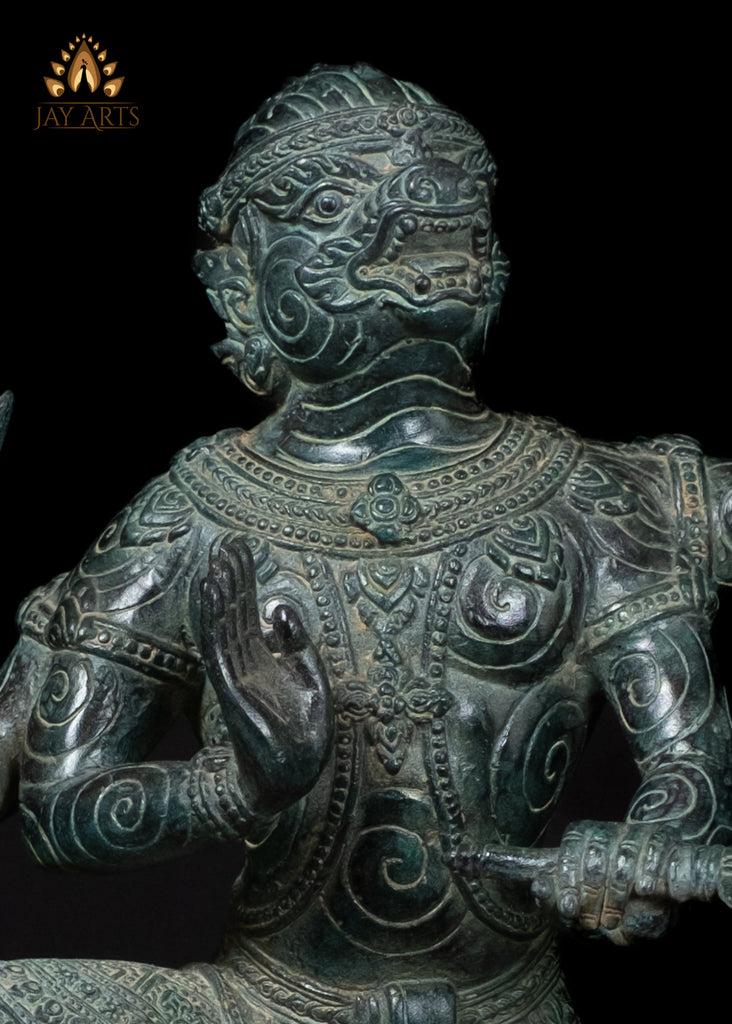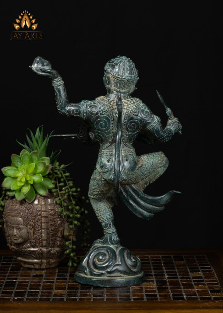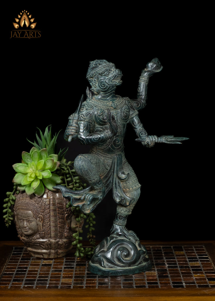 Product description: This finely crafted bronze statue portrays Hanuman in a dynamic dance pose, standing gracefully on a small mount with one leg raised. Depicted with four hands, Hanuman holds a small knife and a stone in his rear hands—the stone symbolizing the mountain he carried to save Lord Lakshmana. His front right hand shows the Abhaya Mudra, offering protection and blessings, while the left hand holds a trident, representing power and divine energy. The statue captures Hanuman’s fiery, expressive face, full of strength, devotion, and determination. His long curling tail extends elegantly behind him, symbolizing agility and divine power, while his detailed monkey claws emphasize his vanara (monkey warrior) form and natural strength. Every feature reflects the distinctive Cambodian style, and the weathered look brings out the depth and details of the statue enhancing the visual appearance that echoes the grace of ancient temples. Each element of the statue contributes to a majestic and spiritually significant sight, highlighting the fine workmanship by our artisans of Cambodia.