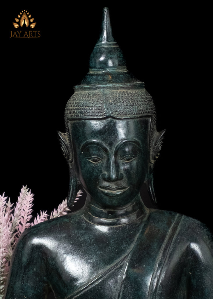 Product description: This beautiful Cambodian bronze Meditation Buddha, depicted in Dhyana Mudra, also known as Samadhi Mudra, embodies the essence of inner stillness and spiritual focus. The Buddha is seated in serene composure, legs crossed in the half-lotus position, with both hands gently resting one atop the other on his lap with palms facing upward symbolizing unity, tranquility, and unwavering concentration. The face of the Buddha has a soft peaceful smile radiating compassion, with eyes downcast and elegantly arched brows. His elongated earlobes, is a symbol of his royal renunciation, and his monastic robes drape around the body in a graceful manner. The protuberance on the top of the head is called the Ushnisha which symbolizes his enlightened wisdom. Every feature reflects the distinctive Khmer style, and the deep green, weathered look brings out the depth and details of the statue enhancing the visual appearance that echoes the grace of ancient temples. A perfect representation of traditional Buddha art highlighting the fine workmanship by our artisans of Cambodia—this sculpture adds positivity and timeless charm to your home, office or any sacred space.