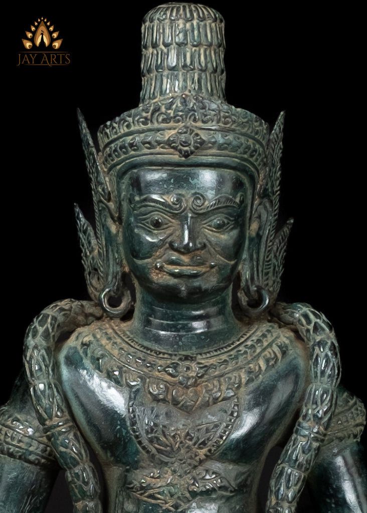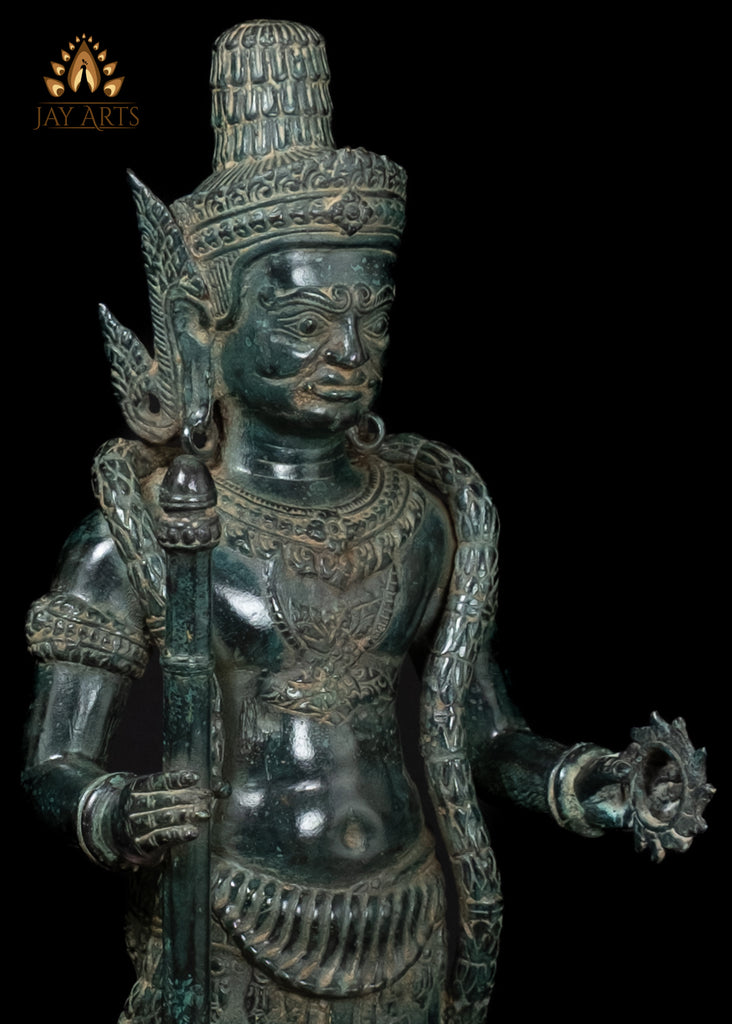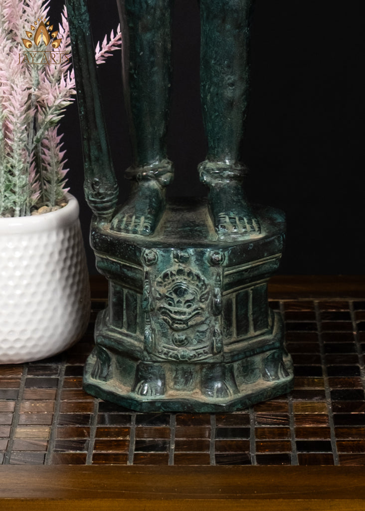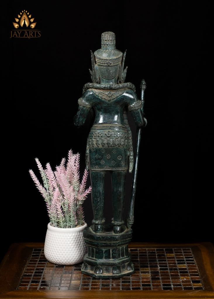 Product description: This finely detailed bronze sculpture represents a Dvarapala, a traditional temple guardian seen throughout Khmer architecture. The statue of Dvarapala is standing erect in an authoritative guarding pose, having a composed, dignified, and noble facial expression. He holds a staff as a symbol of vigilance and protection. The statue is adorned with classic Khmer ornamentation, wearing a layered crown, a decorative waist adornment, and intricate detailing across the chest and arms, where every contour and pattern reveals the precise detailing characteristic of Khmer guardian figures. Cast in bronze with a deep green aged patina, the sculpture carries the appearance of timeless heritage. The guardian stands on a pedestal embellished with mythical motifs, reinforcing his role as a protector of sacred spaces. Elegant, powerful, and artistically crafted, this striking Dvarapala brings strength and cultural depth to any space, highlighting the fine workmanship of Cambodian artisans.
