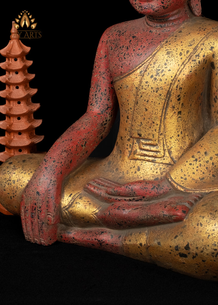 27" Hand-Carved Wood Buddha in Earth Touching Mudra from Cambodia Rustic Red & Gold Finish