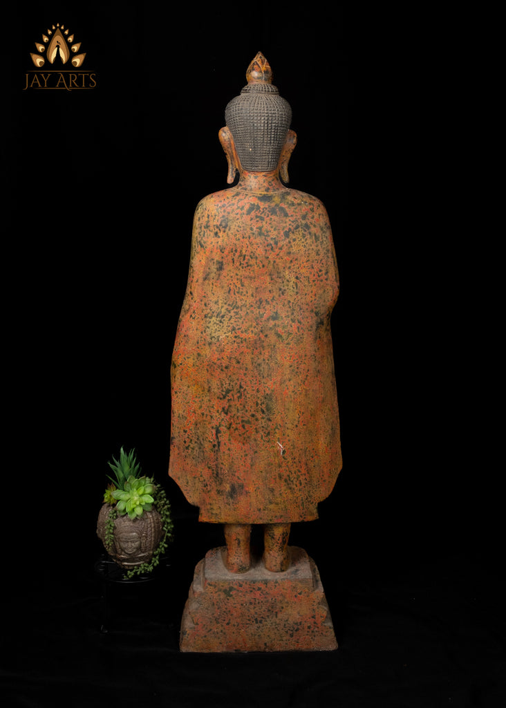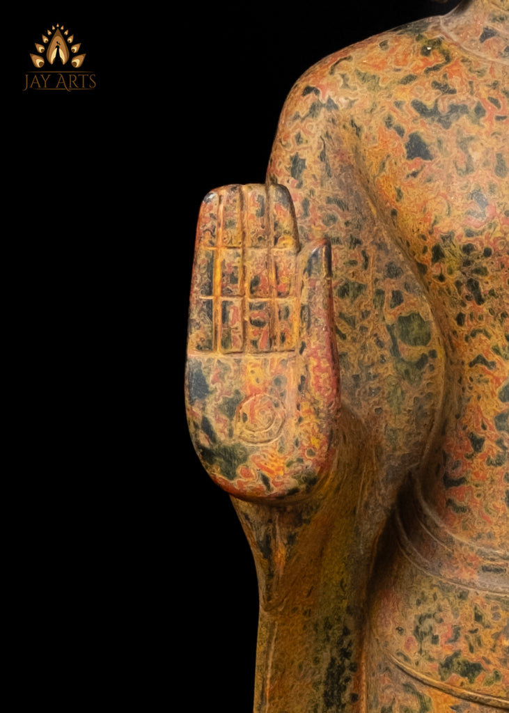 Product description: This wood statue depicts Buddha standing in Abhaya and Varada Mudra, draped in an elegant long robe, presenting a tranquil and graceful representation of the Buddha. The Buddha stands gracefully on a pedestal, his posture grounded and dynamic, conveying stability and calmness. The right hand of the Buddha is raised to shoulder height, palm facing outward, and fingers extended upwards in Abhaya Mudra, which represents protection, reassurance, and the dispelling of fear, while the left hand in Varada mudra known as the gesture of giving represents compassion and granting of wishes. The Buddha’s face is serene and composed, with eyes half closed and carries a pleasant smile that exudes compassion and inner peace. The protuberance on the top the head is called the Ushnisha which symbolizes his enlightened wisdom. The robe is a prominent feature  depicted as long and flowing,  draped elegantly over the body and clings to the form in gentle folds, and the soft mustard finish with subtle dark speckles highlights the contours and details, enhancing the visual appearance of the Buddha. The statue is one of a kind, hand-carved and hand-painted, showcasing the exceptional skill and artistry of Cambodian woodcarvers.