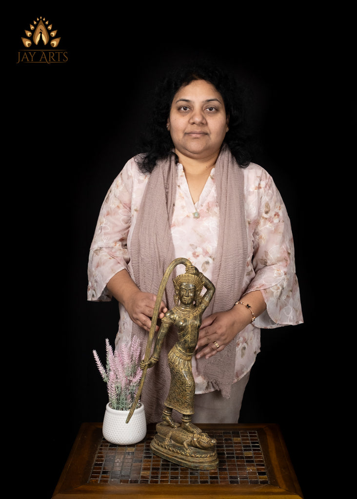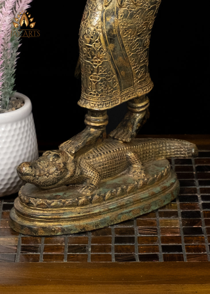 Product description: Phra Mae Thorani is revered as a mythological Earth Goddess in many South East Asian countries. The bronze statue portrays her as a young woman standing on a crocodile, in an elegant pose, wearing traditional long skirt, jewelries and headdress. Thorani’s face is serene and compassionate, embodying both gentleness and quiet strength. Her features are smooth and balanced, with softly arched eyebrows, her eyes are slightly downcast, creating a sense of deep inner peace, and her benevolent smile is warm enough to convey kindness and nurturing presence. She is seen holding her long braid that actually means she is wringing water from her long hair, and helping Buddha continue his meditation and protecting him from Mara, the demon of illusion — This reflects her maternal grace and unwavering tranquility. In Thai, and Cambodian culture, Thorani image is seen in temples, and people seek her blessings for success and divine protection. The bronze statue of Thorani is a beautiful piece depicting her pleasing gesture, and the antique brown patina embraces the statue with an exquisite blend of vibrant hues, invoking a sense of both serenity and enduring beauty.