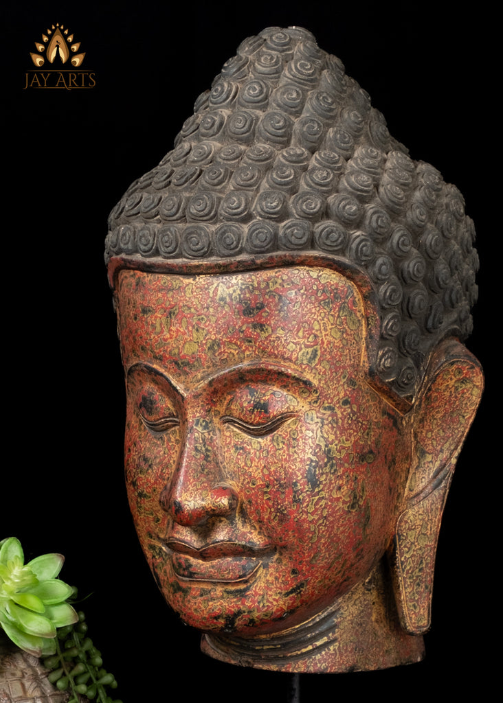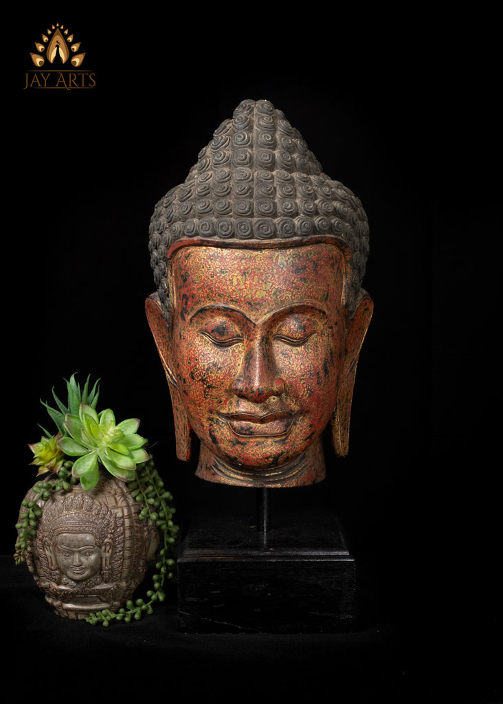 Product description: This stunning large Khmer Buddha head is meticulously hand-carved from rich Cambodian wood and adorned with a warm hand-painted finish. The face of the Buddha has a tranquil expression, eyes are gently downcast, conveying deep serenity and meditative calm. Every curve and feature reflects the grace of traditional Khmer artistry, from the softly contoured lips to the delicately arched brows, the sculpture stands with presence and balance, mounted securely on a solid wooden base. The rustic red with gold and dark speckles harmonize perfectly, making this Buddha head an inspiring focal point for any setting — whether a meditation space, entryway, or interior display, this Buddha head radiates calm energy, cultural beauty, and spiritual harmony. The statue is one of a kind, hand-carved and hand-painted, showcasing the exceptional skill and artistry of Cambodian woodcarvers.