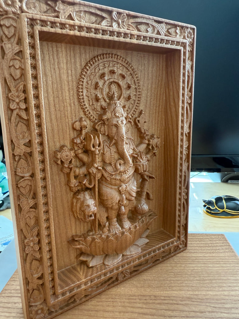 Product description: The wood panel portrays Drishti Ganapathi standing on a fully bloomed lotus flower, and is eight armed. The eight arms holds a goad (ankusha) and a noose (pasha), a chakra and a conch, a sword and a mace, and the front hands holds a trishul, and a fire bowl. His vahana the mouse is present near his feet, along with a ferocious lion standing behind him which symbolizes Maa Durga. The attributes conch, chakra, and mace (Gada) symbolizes Lord Vishnu, the third eye on his forehead, serpents coiled in his trunk, and the fire bowl symbolizes Lord Shiva, and he takes after his mother Parvathi by holding a trishul in his hand. The tip of Ganesh crown has a small lotus flower with the kalasam (holy water pot), and his head is surrounded by Nagadevatas emitting fire, and the fire is surrounded by a circle of eyes. Drishti Ganapathi is a Rudra form of Ganesh and is worshipped in home and office to destroy all the evil effects. Keen attention has been given to the attributes of Drishti Ganapathi and is intricately carved demonstrating a fine workmanship by our team of artists. Wall hanging hardware is attached to the panel.