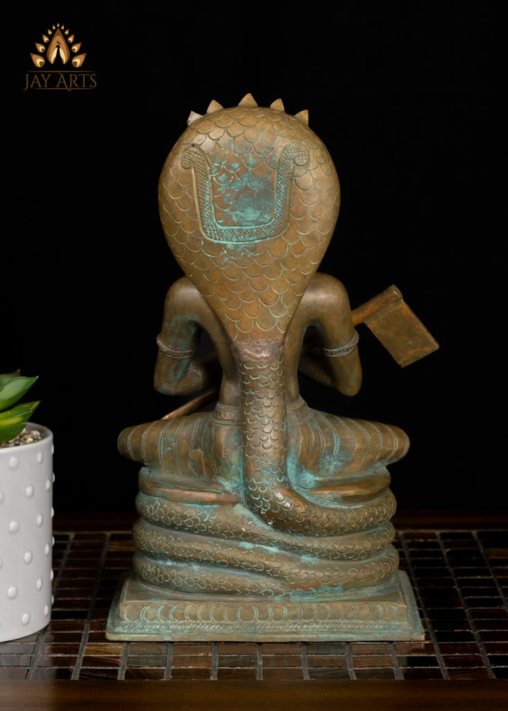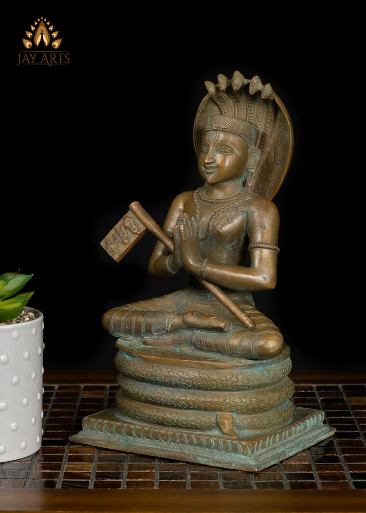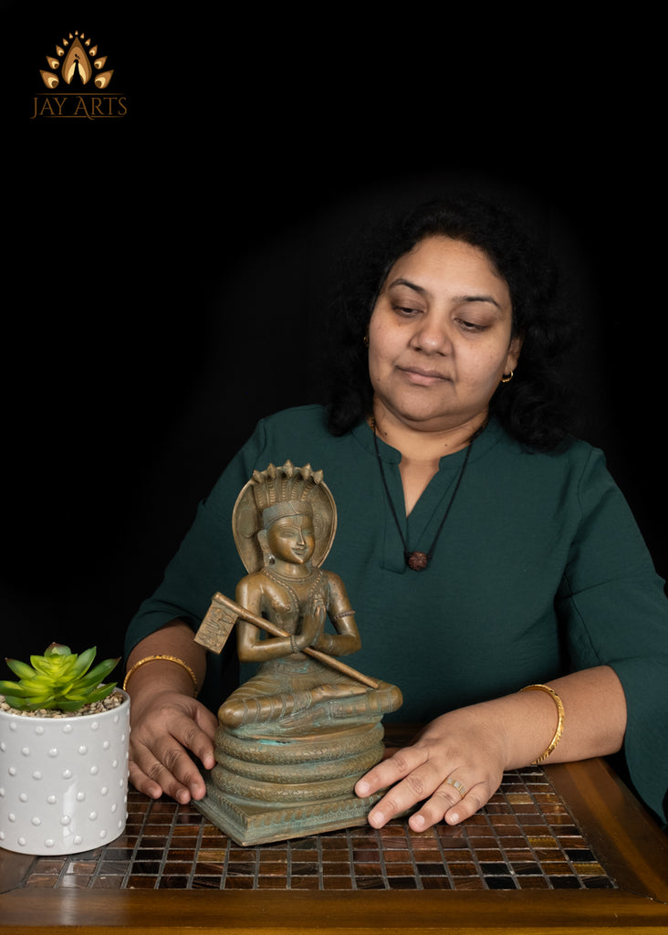 Product description: This exquisite bronze statue depicts Manavala Maamunigal, the revered Sri Vaishnava saint and spiritual teacher. The sculpture radiates grace and devotion, capturing his serene presence and profound humility. Crafted with fine detail, the bronze work highlights his gentle features, seated posture, and the air of deep contemplation that defined his life of service and scholarship. The serpent hood, delicate hand gestures, and subtle expressions reflect his dedication to Lord Ranganatha and his role as a guiding light for countless devotees. The warm, golden-brown sheen of the bronze enhances the statue’s sacred aura, making it a timeless piece for both worship and collection. A true tribute to a saint whose life embodied devotion, simplicity, and surrender, this statue is not only an artistic treasure but also an inspiration for daily meditation and spiritual reflection.