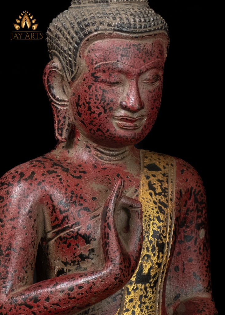 Product description: This exquisite wood statue depicts the Buddha in Vitarka Mudra, the gesture of teaching and wisdom. Seated in serene composure with both legs crossed in the half-lotus position, the Buddha raises his right hand with thumb and index finger joined in a circle; a timeless symbol of intellectual discourse and the sharing of knowledge. Every detail reflects the elegance of traditional Khmer artistry; from flowing robes, elongated earlobes, to a calm smiling expression, and gracefully arched brows. The Buddha’s hair is styled in shell-like curls that rise to a lotus ushnisha, symbolizing his enlightened state. The statue’s smooth surface, warm wood tones and natural grain variations enhance its organic beauty, making it naturally inviting. The statue is one of a kind, hand-carved and hand-painted, showcasing the exceptional skill and artistry of Cambodian woodcarvers. A perfect representation of traditional Buddha art—this sculpture adds positivity and timeless charm to your home, office or any sacred space.