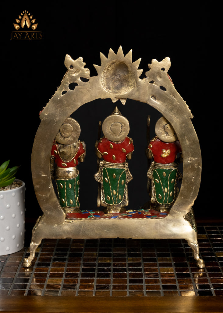 Product description: This beautiful Ram Parivar statue depicts Lord Rama standing at the center in regal poise, his bow resting gracefully by his side, while Sita Devi radiates compassion and grace beside Him. Lakshmana, stands protectively with calm strength, and Hanuman kneels at their feet in Anjali mudra, hands folded in devotion. The vibrant inlay work highlight every intricate detail of their crowns, jewelry, and expressive features. Ram Parivar is not just a statue, it is a symbol of dharma, devotion, and unity. The harmonious blend of colors enhances their celestial presence, making the entire ensemble glow with divine radiance; a sacred blessing for any home or altar.