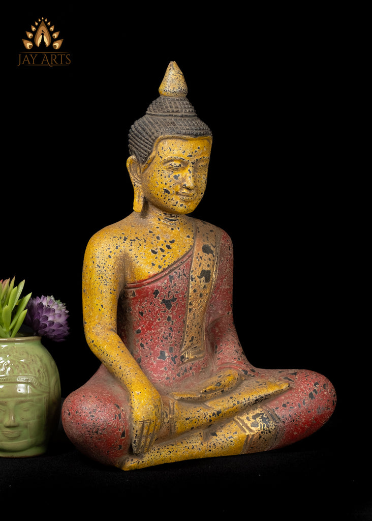 Product description: This beautiful Khmer Buddha statue is hand-carved from natural wood, radiating serenity and spiritual grace. The Buddha is seated in serene composure, legs crossed in the half-lotus position, and depicted in the Bhumisoarsha Mudra, a powerful gesture symbolizing the moment of enlightenment, when he called upon the Earth to bear witness to his awakening. True to Cambodian artistry, the statue features a peaceful, compassionate expression with softly curved brows, elongated earlobes, and a gentle meditative smile. The Buddha’s hair is carved into distinct shell-like curls, rising into a lotus-shaped ushnisha, a sacred symbol of enlightenment and divine wisdom. Warm wood tones and natural grain patterns enhance its organic beauty, making it naturally inviting. This Khmer Buddha brings a grounding presence and timeless sense of reverence to any setting-Ideal for meditation spaces, altars, or home decor. The statue is one of a kind, hand-carved and hand-painted, showcasing the exceptional skill and artistry of Cambodian woodcarvers.