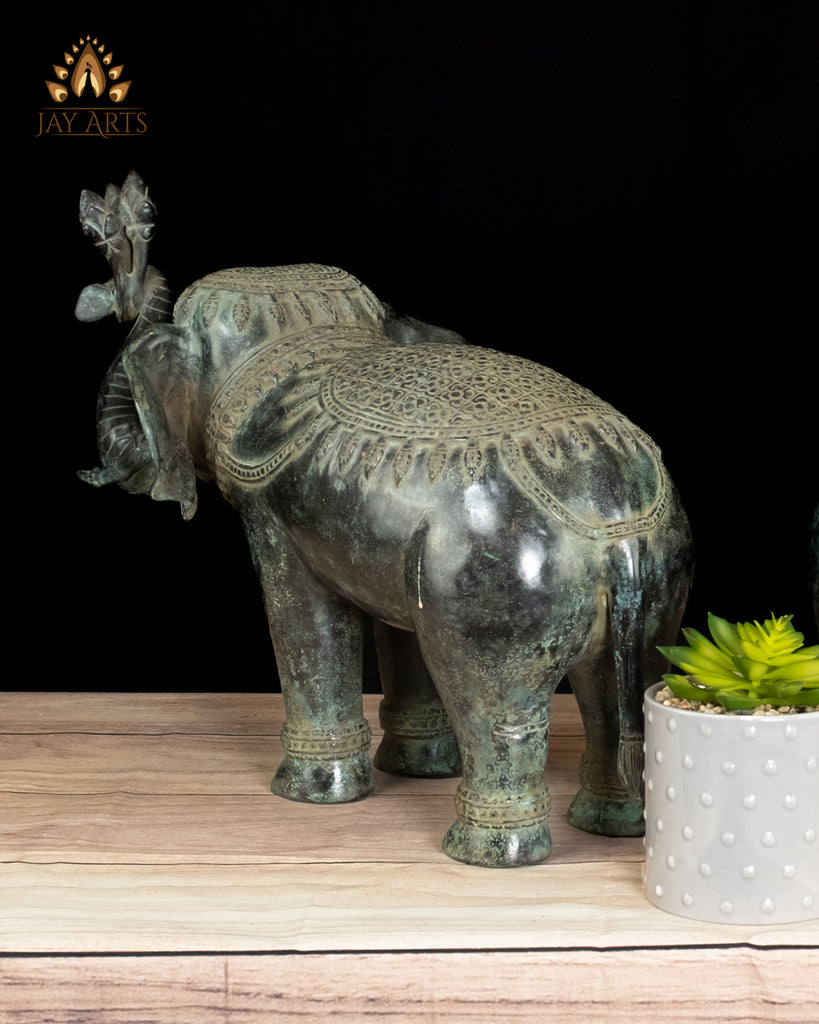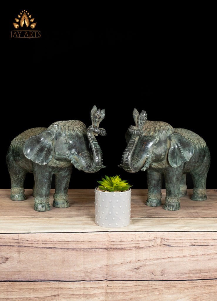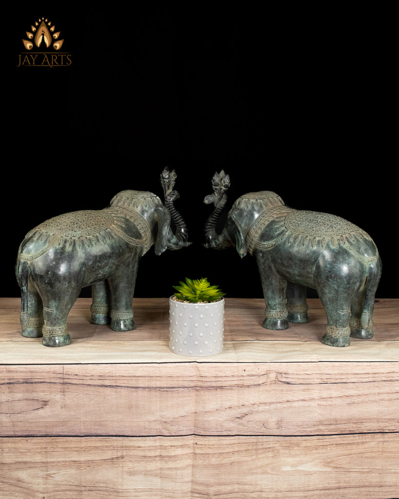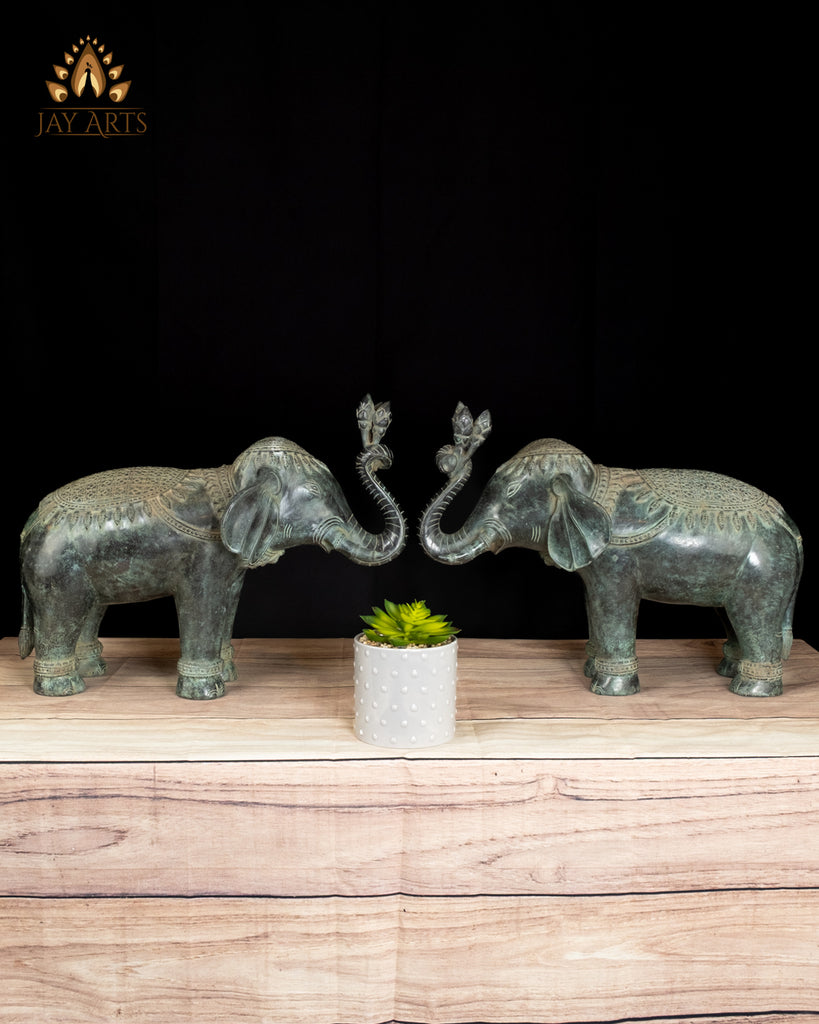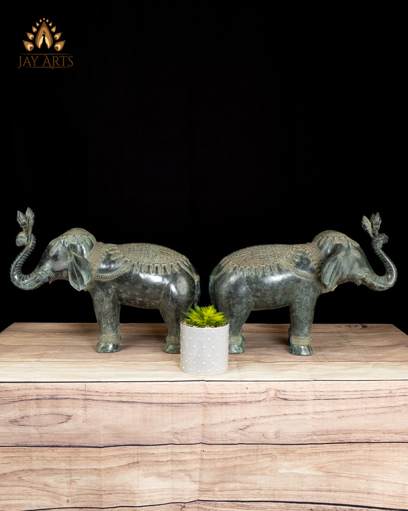 Product description: A graceful pair of Cambodian bronze elephant statues, rich in character and quiet strength, with striking details stands as divine guardians. Each elephant stands firmly with a gentle, dignified posture, their trunks gracefully curved upward—an auspicious gesture symbolizing good fortune, and prosperity. The ears, eyes, and trunk are sculpted with care and attention, giving the elephants a calm, almost meditative presence, and the finely incised patterns blanket the head, back, and harness, echoing classical Khmer ornamental motifs. Subtle decorative bands around the legs add balance and rhythm to the form. The antique green patina transforms the elephant from a decorative object into living bronze, evoking a sense of authenticity and highlighting every curve, crease, and ornament. These elephants embody the Cambodia’s deep cultural reverence for the animal as a symbol of protection, strength, and royalty—Placed as a pair, they create a sense of harmony and guardianship, making them ideal for an entryway, altar, or curated interior space.