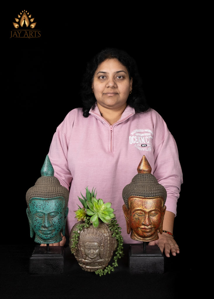 Product description: This striking Khmer Buddha head is meticulously hand-carved from rich Cambodian wood and adorned with a serene blue hand-painted finish. The face of the Buddha has a tranquil expression, eyes are gently downcast, conveying deep serenity and meditative calm. Every curve and feature reflects the grace of traditional Khmer artistry, from the softly contoured lips to the delicately arched brows. Securely mounted on a solid wooden base, the sculpture stands firmly and remains wonderfully stable. The contrast between the calming blue patina and the intentional black spotting creates a harmonious balance of color and texture, making it a captivating focal point for any space. Perfect for a meditation space, entryway, or interior display, this Buddha head radiates tranquility, wisdom, and cultural charm. The statue is one of a kind, hand-carved and hand-painted, showcasing the exceptional skill and artistry of Cambodian woodcarvers.