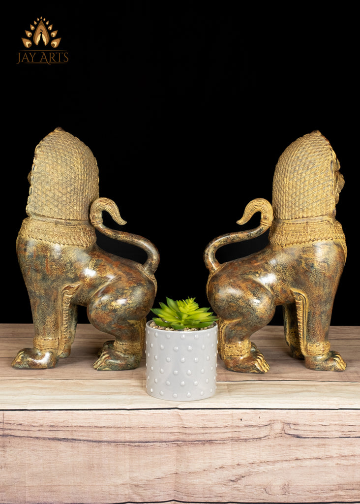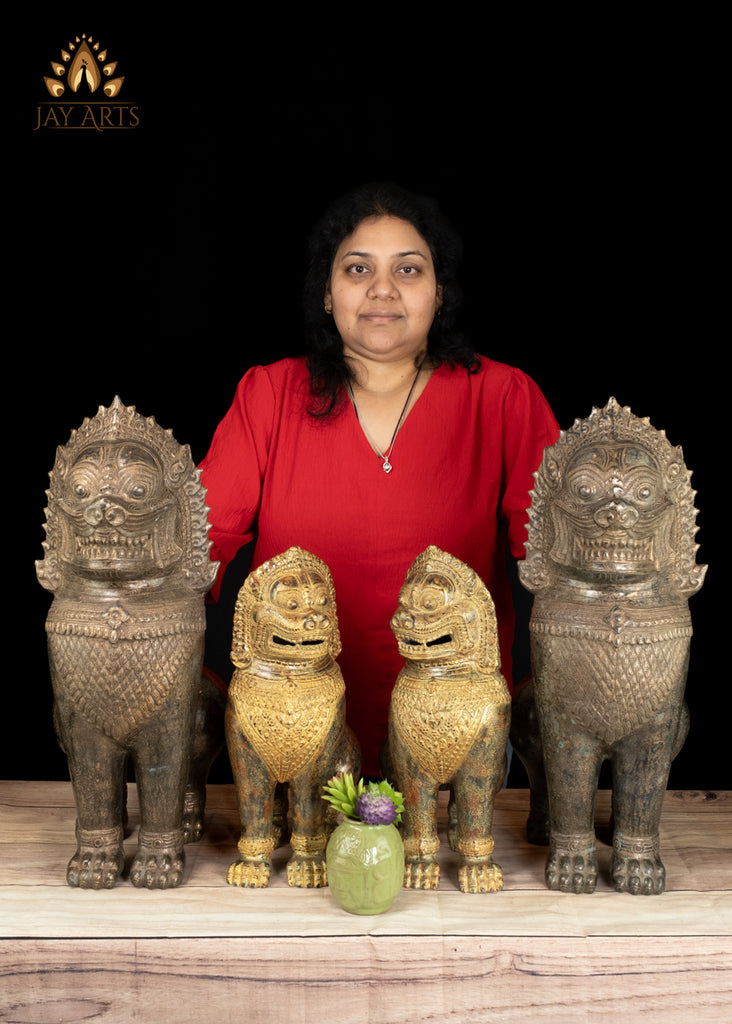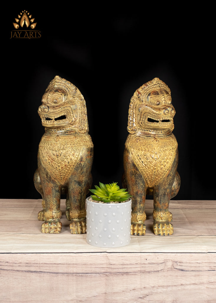 Product description: Temple lions, also known as Guardian lions are architectural iconic features in many East Asian cultures, including Cambodia. The temple lions typical of khmer culture, and seen at the entrances of temples, where they serve as both welcoming hosts and protective guardians. These lions with their imposing presence and intricate details, stand as enduring symbols of strength and protection, deterring malevolent forces, and preserving the sanctity of the temple grounds. Each bronze lion is meticulously crafted with exquisite fine details, with a robust physique exhibiting a combination of fierceness, and nobility in their expression. The large expansive eyes with etched pupil, the arched eyebrows, prominent nose, the curly mane, a wide mouth showing their sharp teeth, the paw capturing the power and grace of the lion, are typical characteristics of temple lions displaying a formidable, yet dignified countenance, showcasing the craftsmanship and artistic prowess of our Cambodian artisan. The antique brown patina on the statue has an interesting array of varying shades and tones that evokes a sense of history, and authenticity, making it a timeless elegance to any space. Admire the splendid bronze temple lions, radiating both power and elegance highlighting the fine workmanship by our artisans of Cambodia.
