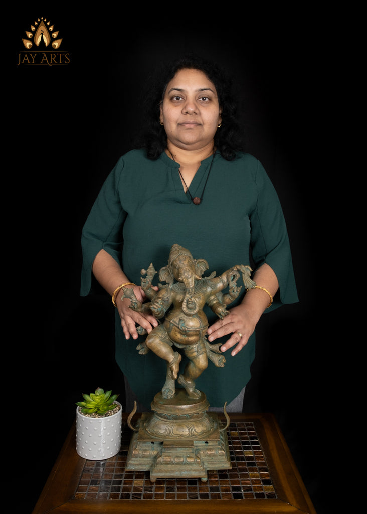 Product description: The dancing form of Ganesha is referred to as "Nritya Ganapati" or "Nartana Ganapati," where "Nritya" or "Nartana" means dance. The bronze dancing Ganesh is a stunning piece, that portrays the joyful expression of the divine with one leg raised and the other firmly resting on the lotus base, displaying a sense of movement and energy. His dance posture is not only an embodiment of the fusion of spirituality and artistic expression, but also signifies the rhythmic and harmonious nature of the universe. Ganesh has four arms, each holding various attributes and symbols that represent different aspects of his divine nature. In his rear hands, he holds a goad and a pasha (noose), while his front right hand holds his own broken tusk, and left hand holds a modak (Sweet delicacy). The face of Ganesh exudes a sense of calm and divine grace, and he is adorned with decorative ornaments, including necklaces, arm bracelets, leg anklets, and a beautiful crown. The presence of a dancing Ganesha statue is a source of inspiration, a symbol of auspiciousness, and the bronze statue is certainly a visual representation of the divine. The statue of bronze dancing Ganesh is indeed a beautiful piece with a traditional antique patina, and is One of a kind statue made using the lost-wax method; an expert craftsmanship by our South Indian bronze artisan.