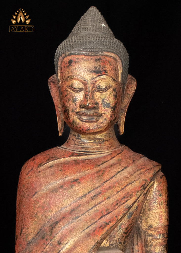 Product description: This beautifully carved wooden Buddha statue stands on a lotus base in a serene poise, holding a rounded alms pot gently against his abdomen, a symbol of humility, compassion, and the sacred act of giving. His expression is calm and content, with a soft smile, and elongated ears symbolizing wisdom and enlightened awareness. The flowing robe, sculpted with delicate folds brings movement and softness to his posture, that represents purity of spirit and detachment from worldly burdens. A warm reddish-brown patina with gold undertones gives the surface a weathered, antique charm, accented with dark speckles adds depth and character to the statue. The Buddha is a powerful symbol of gratitude, and mindful living; perfect for any space seeking spiritual balance and inspiration. The statue is one of a kind, hand-carved and hand-painted, showcasing the exceptional skill and artistry of Cambodian woodcarvers.