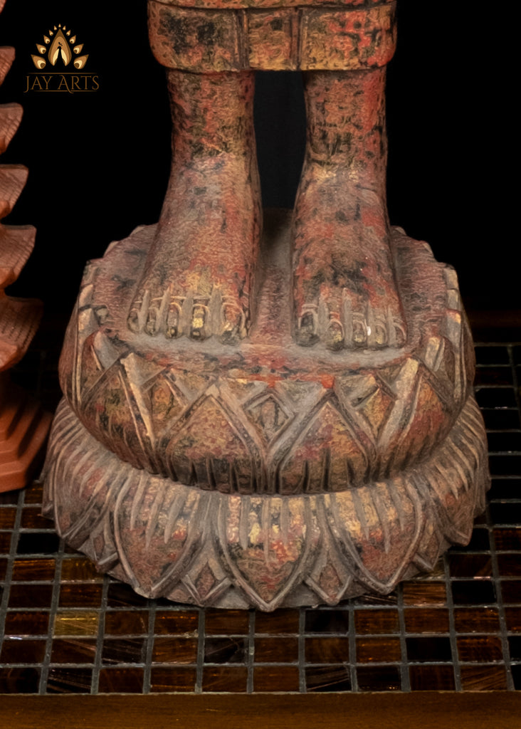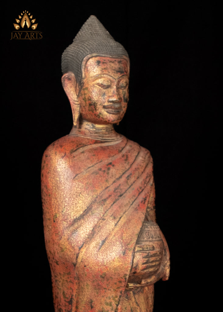 38” Cambodian Standing Wood Buddha with Alms Pot – Symbol of Compassion