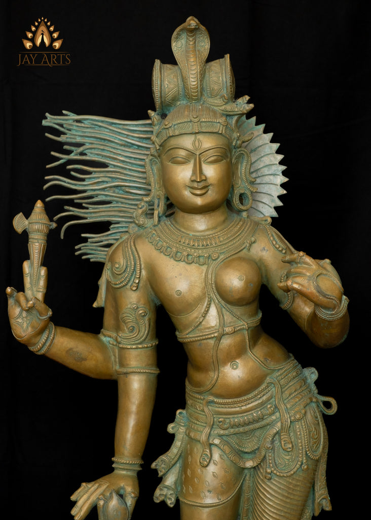 Product description: This bronze Ardhanarishvara statue is a breathtaking vision of divine balance and harmony. The sculpture unites Shiva and Parvati in a single form, their bodies seamlessly fused to embody the eternal truth that wholeness arises when strength and compassion, the masculine and feminine within us exist in perfect balance. On the right side, Shiva radiates ascetic strength, with broad shoulders, a defined torso, and flowing locks crowned by the crescent moon. One hand holds a goad, while another gently feeds his loyal dog. His serene expression reflects the calmness of supreme detachment. On the left, Parvati glows with grace and softness. Adorned with delicate ornaments and gentle features, she embodies compassion, beauty, and nurturing energy. Unique in its commanding size, this Ardhanarishvara radiates a profound spiritual presence, crowned by Shiva’s sacred drum, around which a serpent coils. The bronze surface, with its rich aged patina and subtle golden highlights, brings depth and warmth, while the intricately carved clothing and ornaments including necklaces, and anklets reflect the artisan’s mastery. Every curve and detail is rendered with precision, making the statue not only a sacred icon but also a work of art of timeless beauty. The statue of bronze Ardhanareesvara is certainly a divine representation of Lord Shiva, and Shakti, and is one of a kind statue made using the lost-wax method; an expert craftsmanship by our South Indian bronze artisan.