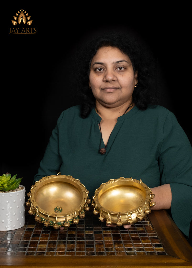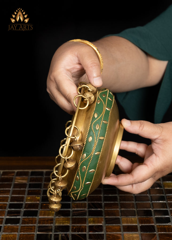 6" Elegant Brass Urli Bowl with Green Inlay for Home Decor