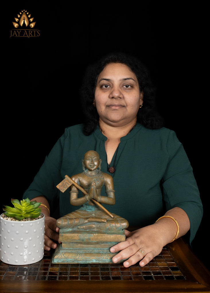 Product description: This finely crafted bronze statue of Sri Ramanujacharya beautifully represents the great Vaishnava saint and philosopher, revered for his teachings on devotion and spiritual equality. The sculpture portrays Ramanujacharya in a traditional seated posture, with hands folded in Anjali mudra, symbolizing humility and surrender to the Divine. Every detail is skillfully rendered; from the flowing ascetic robes, the sacred tilaka on his forehead, to the lifelike expression of serenity and compassion on his face. The rich bronze finish enhances the statue’s timeless presence, giving it both durability and an aura of spiritual warmth. Perfect for meditation space or home altar, this sculpture is more than a work of art; it is a living presence of Ramanuja’s vision of bhakti and equality, reminding every devotee of his message of inclusivity and the soul’s eternal connection to God.