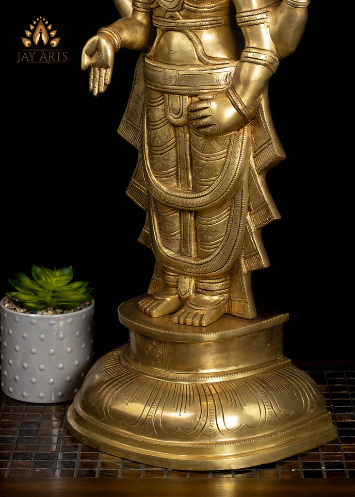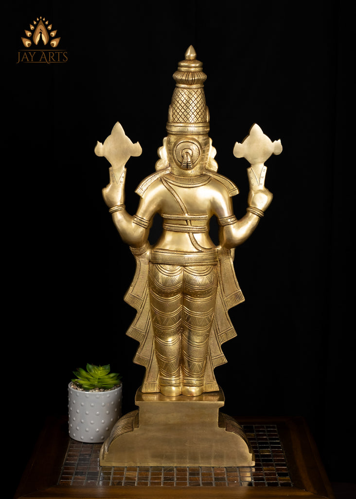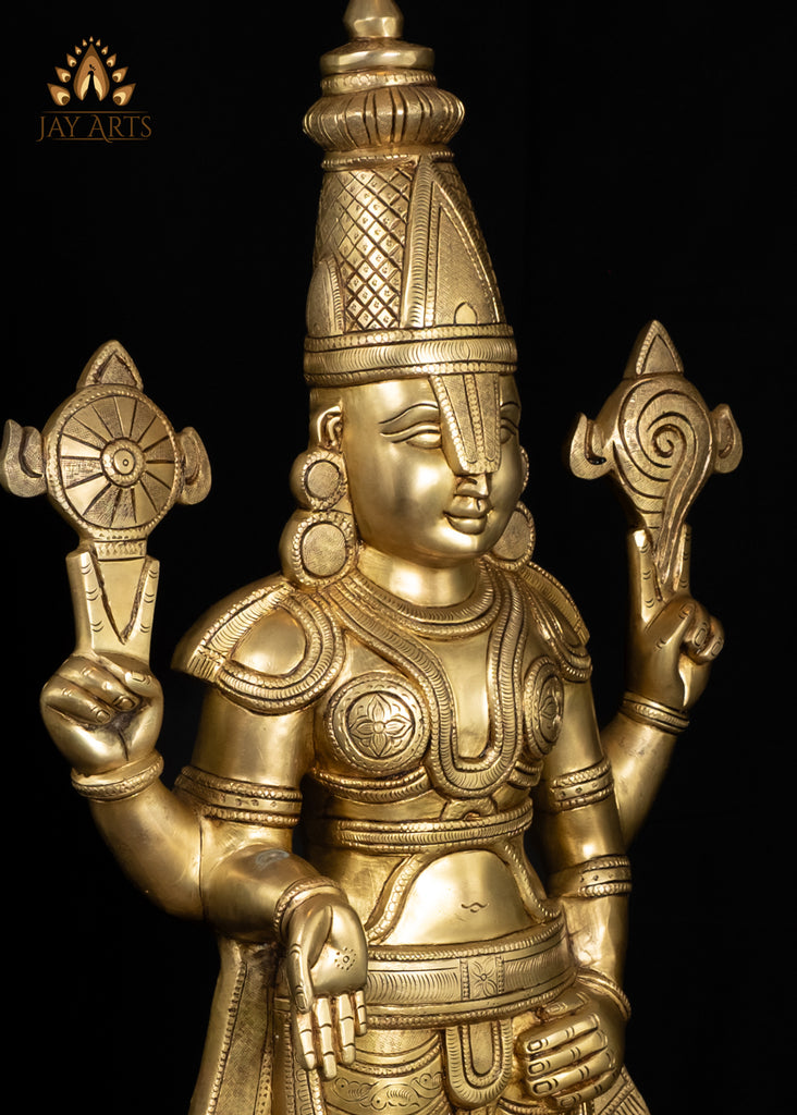 Product description: The brass Balaji statue in a gleaming golden yellow glow exudes a powerful yet tranquil presence, commanding reverence and devotion. The statue is depicted standing on an inverted lotus base, adorned with artistically designed clothing, and elaborate ornaments. The statue has an elaborate broad base with intricate engravings and patterns adorn its surface, filled with deep patina hues of emerald green and golden yellow, creating an elegant contrast against the warm metal with a radiant glow. The face of Balaji looks serene with a gentle divine smile. His right hand is in varada mudra, and his left hand is resting on his thigh, which is a typical pose of the divine. The iconographical attributes of Balaji, including his tall crown called kiritam, the Namam (Tilak) on his forehead, layers of fine jewelry, divine symbols in hand, and all other features are meticulously crafted radiating the essence and glory of the deity. The statue has a well-balanced, majestic presence, exuding a sacred aura making it a focal point of worship and a powerful symbol of devotion. Certainly, a stunning brass statue radiating a divine aura, and a timeless symbol of new beginnings enhancing its beauty and presence.